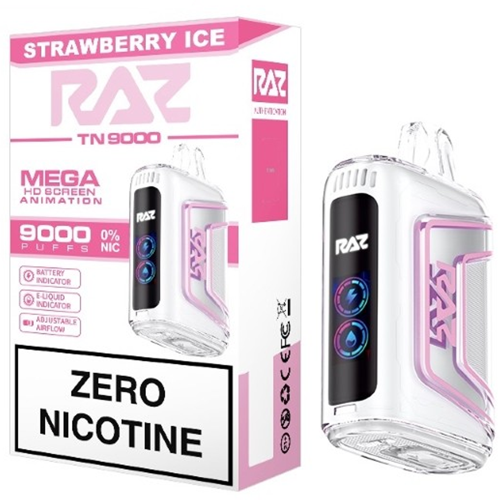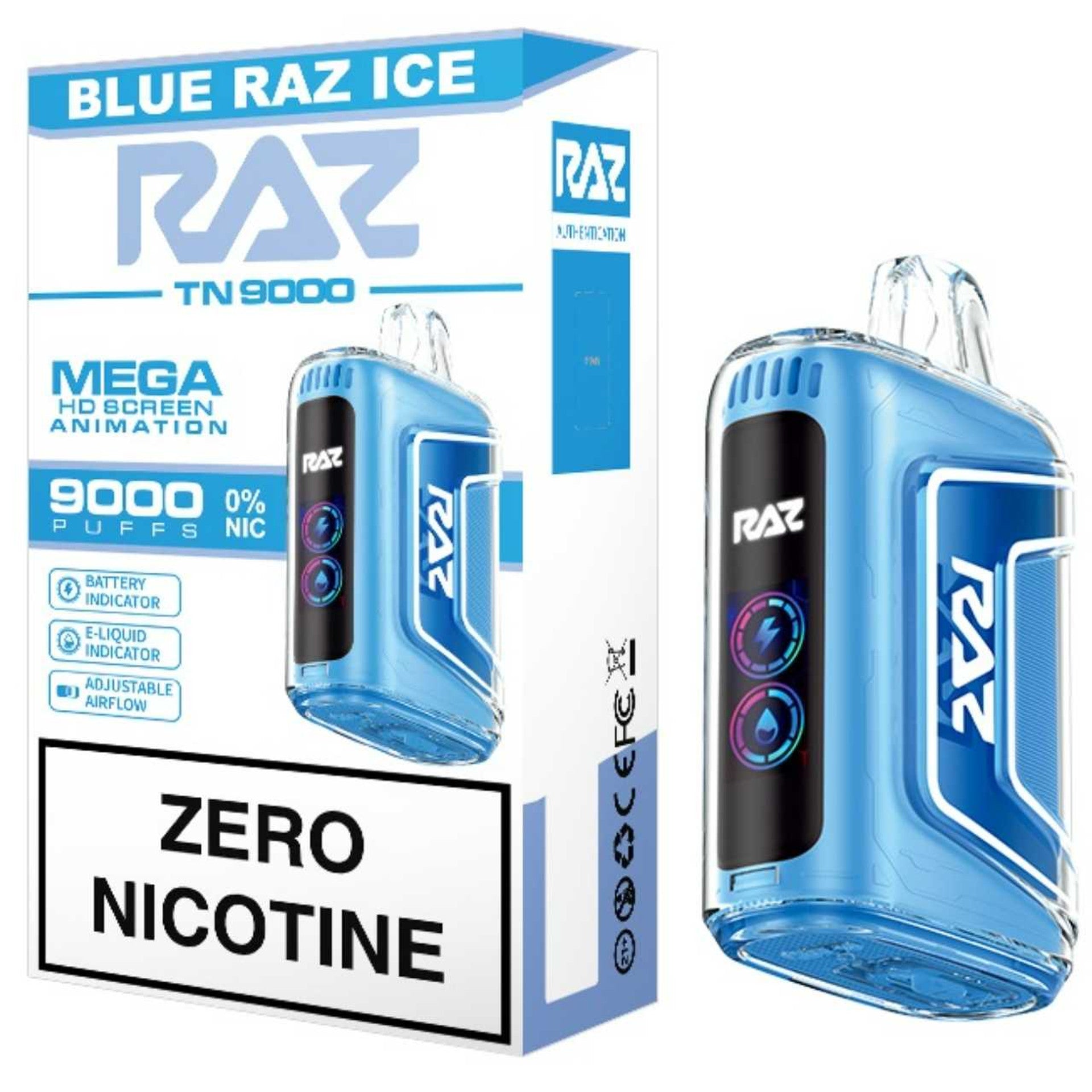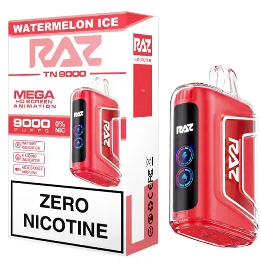 Raz TN 9000 Nicotine Disposable... now in 0%! Mega HD screen, rechargeable battery, adjustable air flow. 9000 puffs of 0% nicotine.